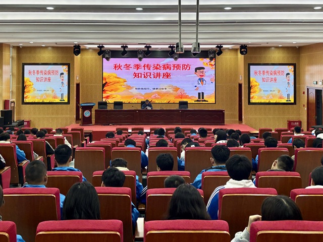 10 月 23 日,我校举办秋季传染病预防专题讲座,聚焦诺如病毒、流感病毒、肺炎支原体感染等秋季高发传染病,旨在科学筑牢校园健康防线。校医姚志民担任主讲,全校各年级师生代表及班主任共同参与。