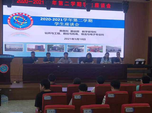 5月18日下午,我校在实训楼五楼报告厅召开2020-2021学年第二学期学生座谈会,教务科科长杨永宏主持会议,基础部、教学督导科、钻井与工程专业科、数控与机电专业科、物流与电子专业科负责人和相关人员及71个班级的学生代表参加。