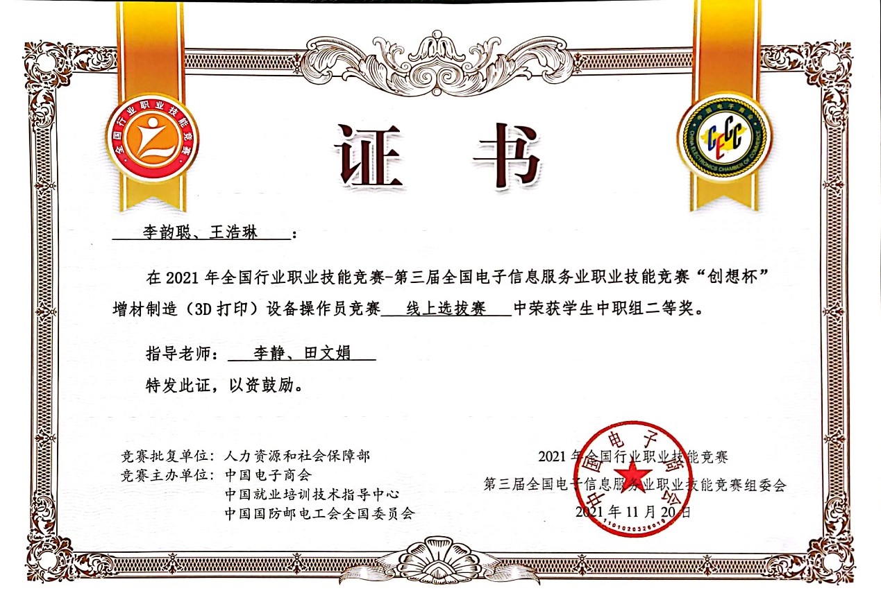近日,我校学生在2021年全国行业职业技能竞赛—第三届全国电子信息服务业职业技能竞赛“创想杯”增材制造(3D打印)设备操作员竞赛线上选拔赛中获奖,两支参赛队伍分别获得二等奖和优秀奖。