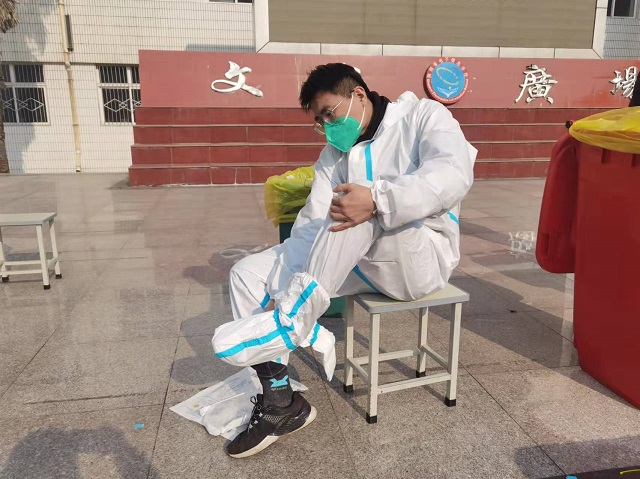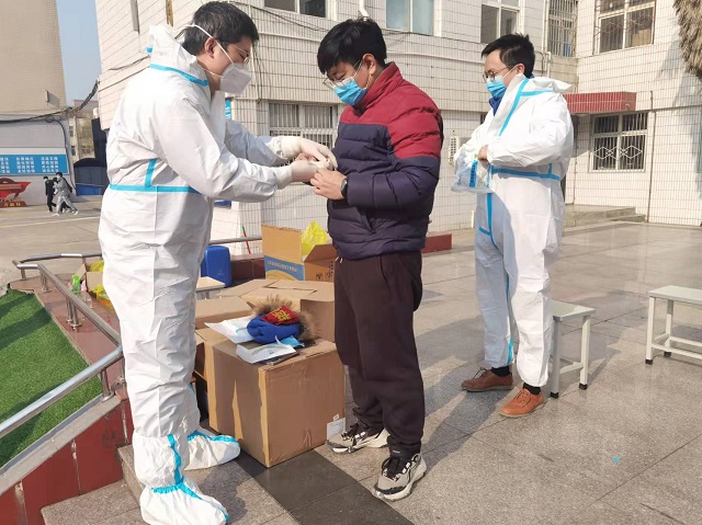 12月18日学校实施封闭管理,周闯立刻主动请缨,返校到岗,积极配合学校做好疫情防控工作。除了本职教学工作,他多次穿上厚重严实的防护服,配合采样人员进行信息录入、身份核验、秩序维护等工作。放下教科书,穿上防护服,转变的是角色,不变的是心系学校的赤诚。
