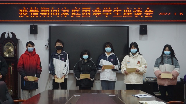 在受资助学生代表座谈会上,学校领导对我校学生在疫情防控期间积极配合防控安排的表现予以认可和表扬,表示学校会持续关注学生生活,不让任何一名学生因生活困难而失学辍学,希望大家懂得感恩,坚定信心,抗击疫情,共渡难关。受资助学生对学校的关心和关爱表达感谢,表示会严格遵守学校的疫情防控安排,常怀感恩,学好技能,回报社会、学校和家庭。