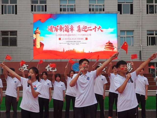 校园内悬挂“欢度国庆节喜迎二十大”、“共爱一面旗同唱一首歌”、“清澈的爱只为中国”等横幅,校园广播、微信公众号、视频号、电子屏等宣传平台发出对祖国的深情告白和美好祝愿,营造出一片欢乐祥和的喜庆氛围。