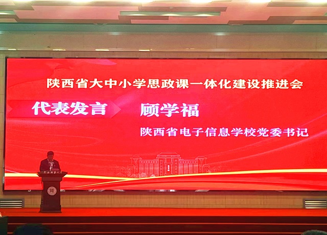 4月6日上午,陕西省委教育工委、省教育厅在陕西师范大学召开全省大中小学思政课一体化建设推进会,省委教育工委书记刘建林出席会议并讲话。省委教育工委委员、省教育厅副厅长赵昶葆主持会议。我校党委书记顾学福参会,并代表中等职业学校在会上作题为“聚焦课堂 突出实践,把思想政治工作贯穿教育教学全过程”交流发言。