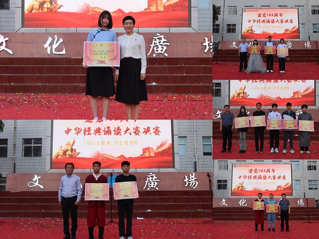 比赛现场,各代表队或慷慨激昂,或柔和婉转,深情演绎了《青春中国》、《我爱你,我的祖国》、《祝福你祖国》、《盛世中国》、《诗意中国》等经典作品。诵读中满怀对中国共产党波澜壮阔奋斗历程的自豪感、对党的热爱和感恩之情、对党和国家未来的坚定信心和美好憧憬,声声洪亮,句句传情,将贯穿百年的红色精神以声音传递,让红色基因根植在每位师生心间。经过激烈角逐,最终评选出一、二、三等奖和优秀奖,校领导为获奖团队颁奖。