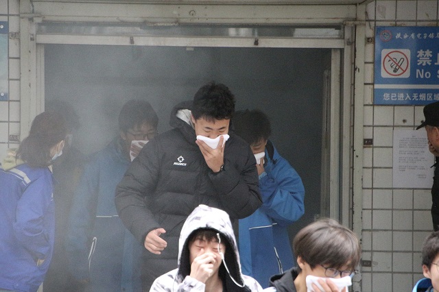 11月9日13时30分,急促的哨声伴随着浓重的烟雾弥漫在整个学生公寓,同学们立刻寻找毛巾打湿并捂住口鼻,弯下身子按照预定紧急疏散路线有序撤离到指定安全地点,这是我校应急疏散演练现场,演练过程中,安保科、学生工作部老师及公寓管理员、安保人员等分别在各个楼梯口维持秩序,保证学生安全,整个演练环节师生行动有序、配合默契,本次应急疏散演练共用时XX。15时,初期火情灭火实战演练在学校操场进行,安保科科长畅建为楼管、教官、安保人员、班主任、学生代表详细讲解灭火器的种类、使用方法及注意事项,在场人员依次使用灭火器对初期火情进行扑灭。