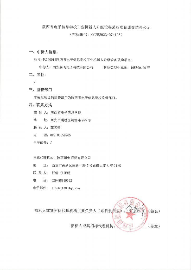陕西省电子信息学校工业机器人升级设备采购项目成交结果公示